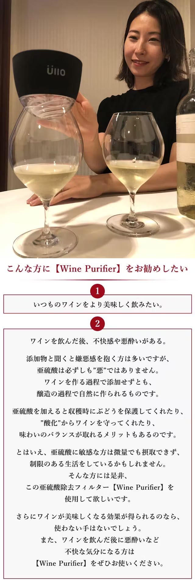 日本で不純物の亜硫酸が少ないワインを味わえるのは、本プロジェクトの【Wine Purifier】だけです。