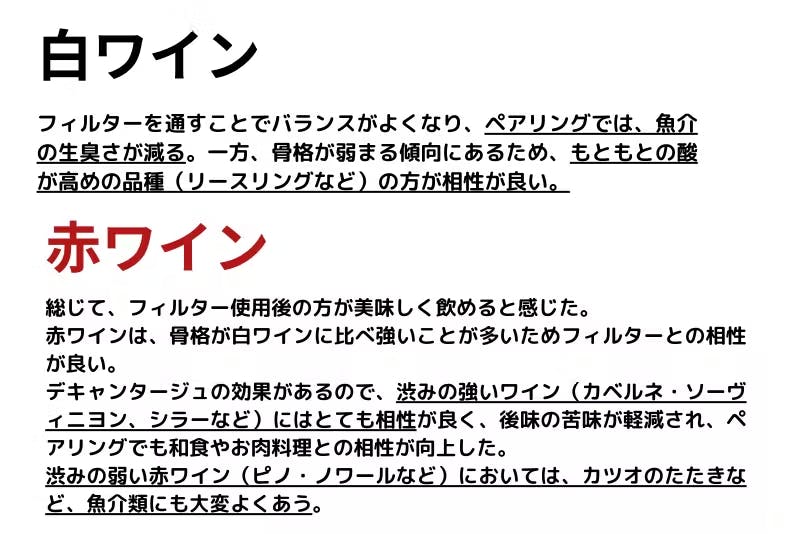 不要な化合物がワインに新たに入らないので、ワインにダメージを与えず、ワイン本来の味わいを楽しめます。物理的に粒子径の違いを利用したフィルターを使う方法は、ワインの美味しい、残したい成分も除去してしまいますので、ワインには使えないのです。