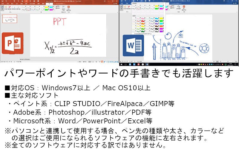 ※パソコン上の、どこにでも「手書き」出来るものではございません・あくまで「パソコンソフトの手書き機能」に対応するものです・書く際の「色、太さ、ペン先種類」なども使うソフトで調整することになります。・書いた内容を保存する際も、お使いのソフトとしての保存となります。