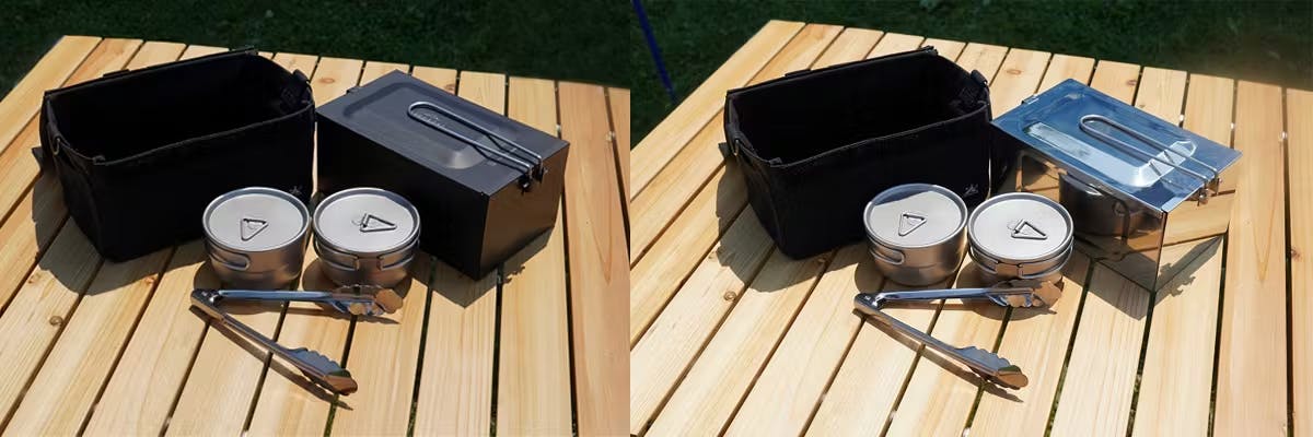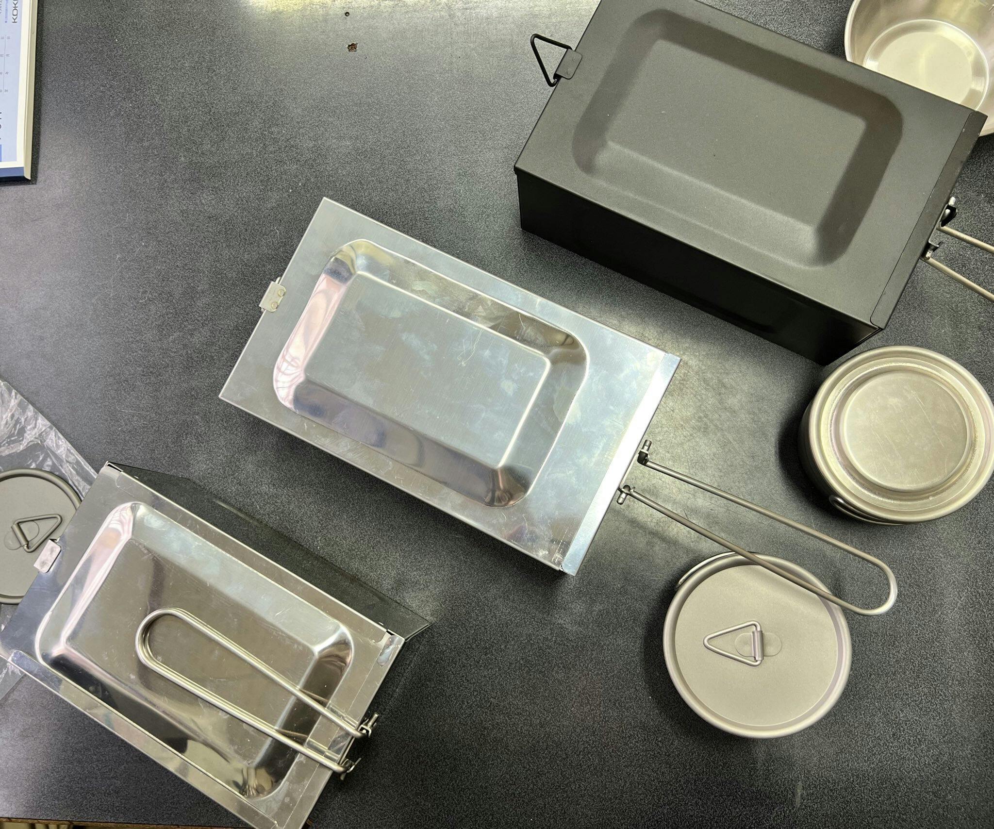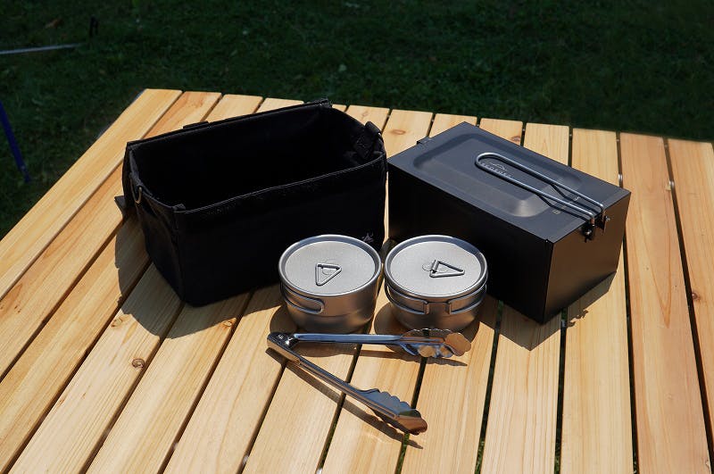 3.本体(「ブラック」もしくは「シルバー」)・小型トング・concosメスティンカバー(限定コラボバージョン)・チタン製 蓋つきスタッキングカップ×2個