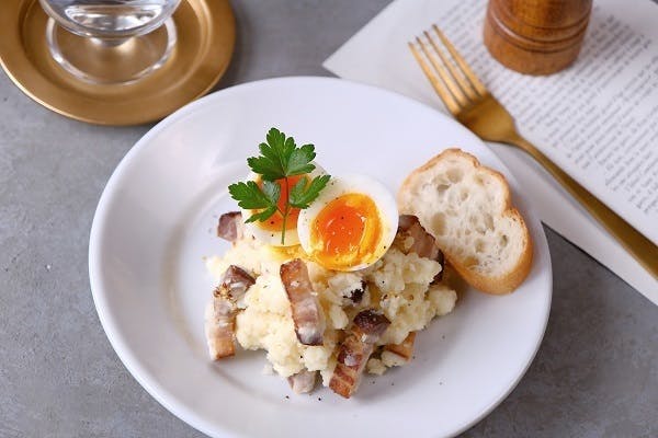 調理時間:20分下準備:卵は水から8分茹でて、半熟卵を作っておく。①じゃがいもの皮をむき6等分にする。鍋にじゃがいもがかぶる程度の水を入れ、串が通るまでゆでる。(10分ほど)②ベーコンを長さ3㎝、幅1㎝に切り分ける。③フライパンに油を引かずに②を入れ、軽く焼き色がつくまで炒める。④①に火が通ったら水気を切り、熱いうちにつぶす。⑤③を加え軽く混ぜ合わせる。⑥●の調味料を加えさらに混ぜ合わせる。⑦器に盛り、半熟卵をのせる。食べる時には卵をつぶしながらいただく。ポイント:ベーコンは大き目に切ることで、存在感も出て、食べ応えも増します。じゃがいもは熱いうちにつぶすと、つぶしやすいです。