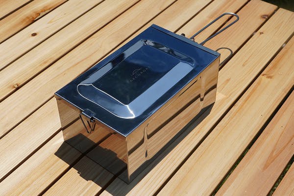 メスティンサイズの燻製器。持ち運びに便利で小さく軽い。もれる煙も少なく室内でも使え、気軽に燻製を楽しめます。