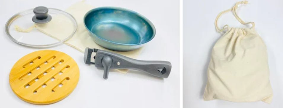 フライパン、グリップ、ガラス蓋、鍋敷き、収納袋 の5点セットです。