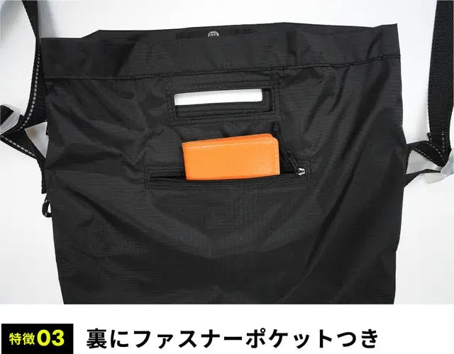 裏面にファスナーポケットがついているので、頻繁に使用するスマートフォン、財布、鍵などをすぐに取り出せます。