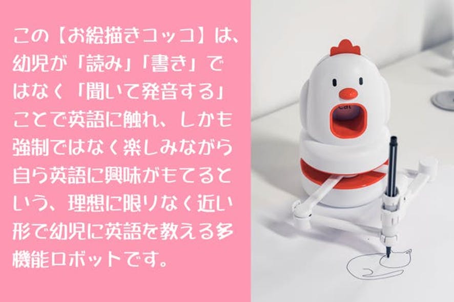 英語教育が小学校3年から始まり日本の英語学習環境が劇的に変化しています。多くの幼稚園・保育園でも英語を教え始めた今日、幼児の英語教育が注目されて来ました。この機会に、幼児に英語を学習させるロボット【お絵描きコッコ】をご紹介できるのは大きな喜びであります。お子様のご両親はもとより、お孫さんへのプレゼントとして最適な商品ですので、ご支援のほどよろしくお願い致します。