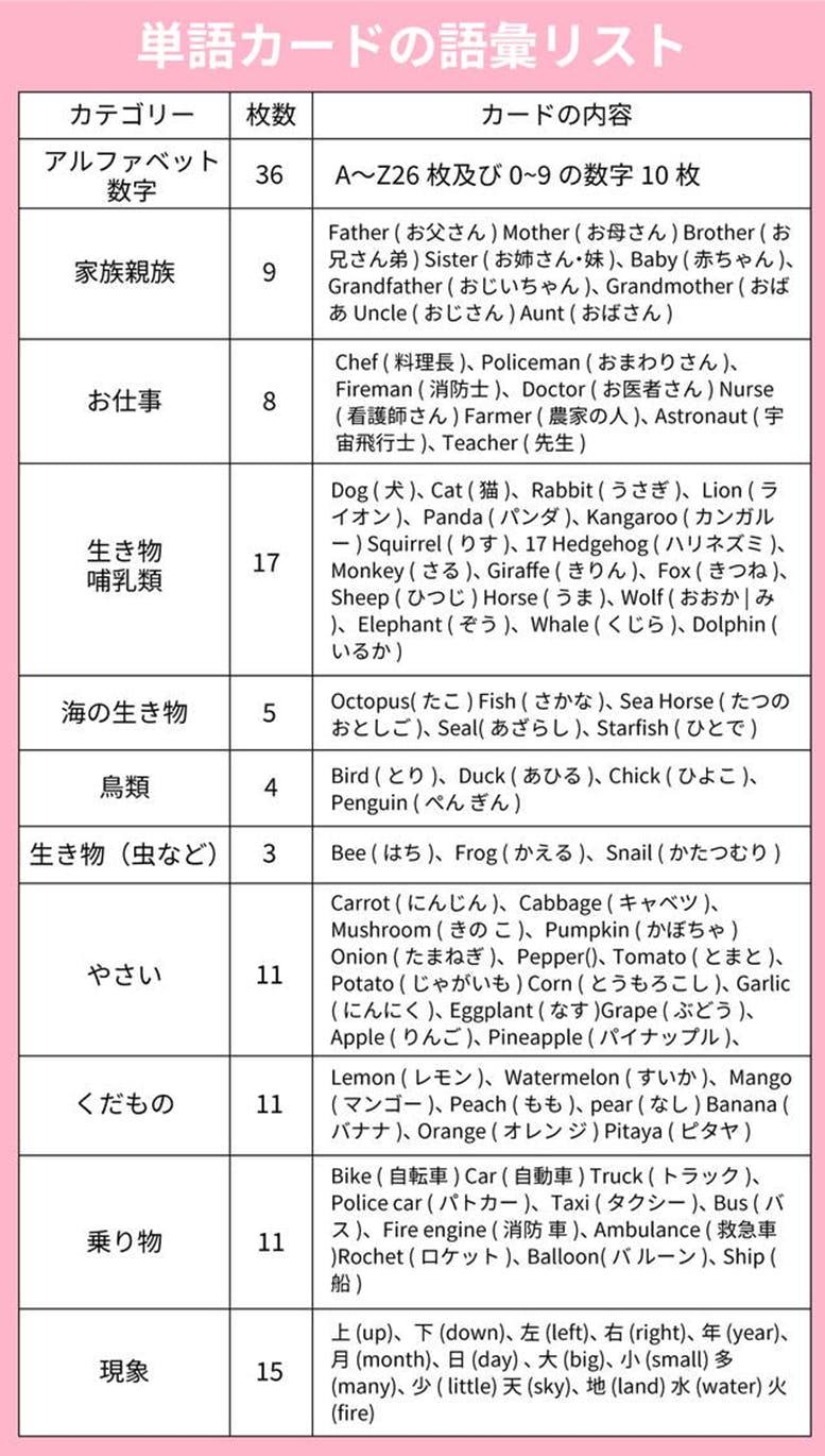 単語カードは身近な生活に関するものを中心に、各分野で合計130枚ほどセットされています。そして、英検ジュニア受験に必要な300~500枚に増加して行く計画です。つまり、子供たちが飽きず、より多くの英単語が学習できるように、今後も新しい単語カードをリリース予定です。ぜひご期待ください。
