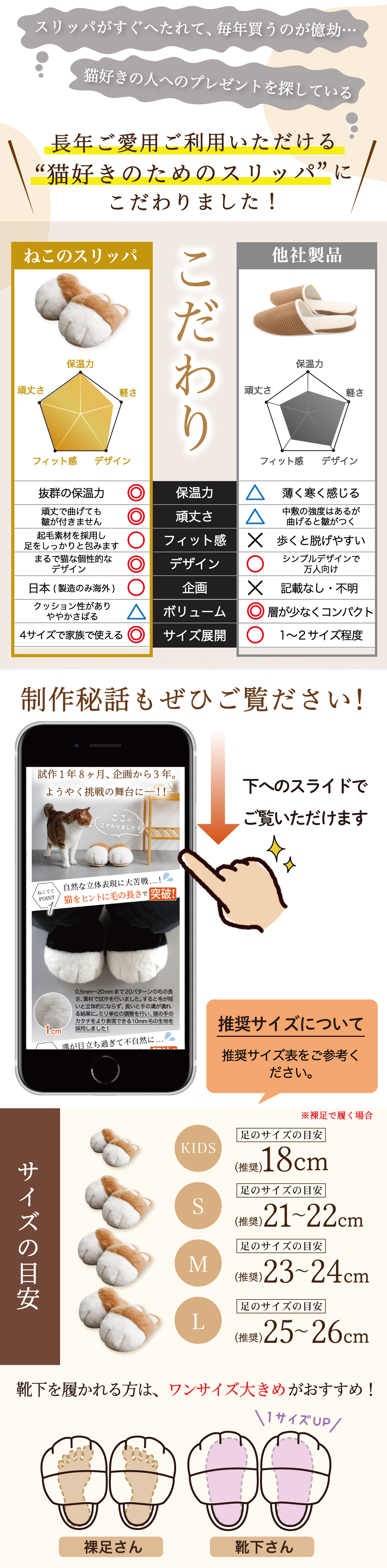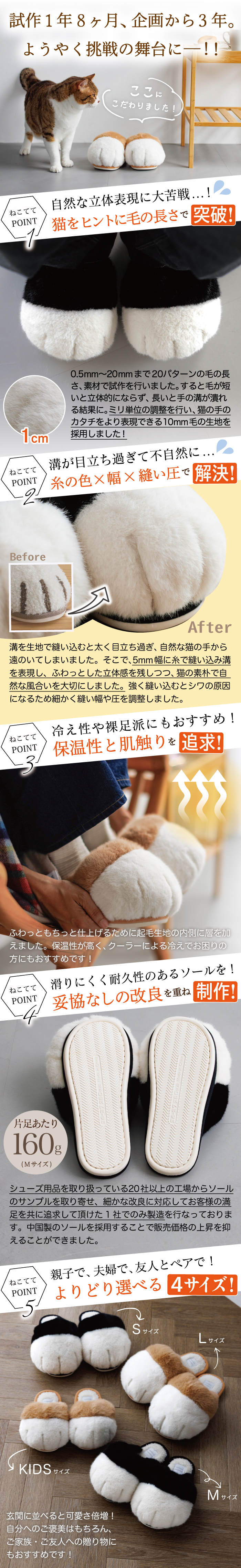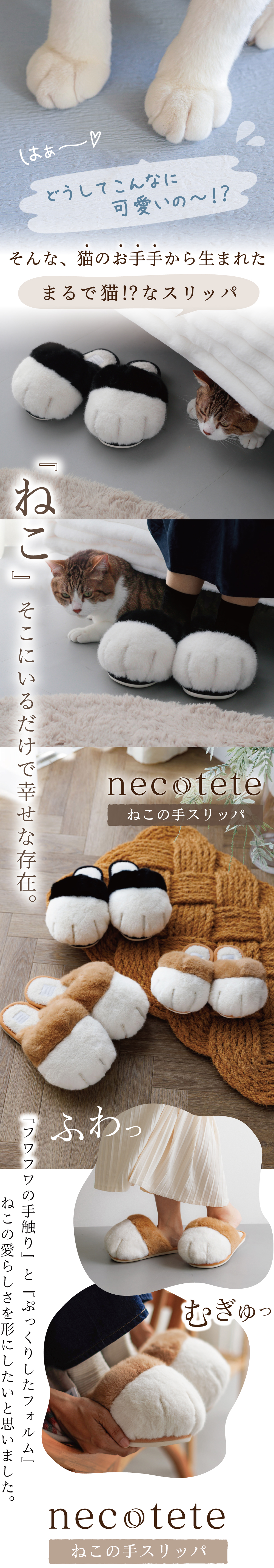 毎日会える大切な人へ、なかなか会えない大切な人へ、毎日頑張る自分へ。開けた瞬間から猫が溢れ出してクスッとなれる商品です。ほっこりとした癒しと笑顔を届けられる、『ねこの手スリッパ〜necotete〜』がそんな商品になれたらと思っています。