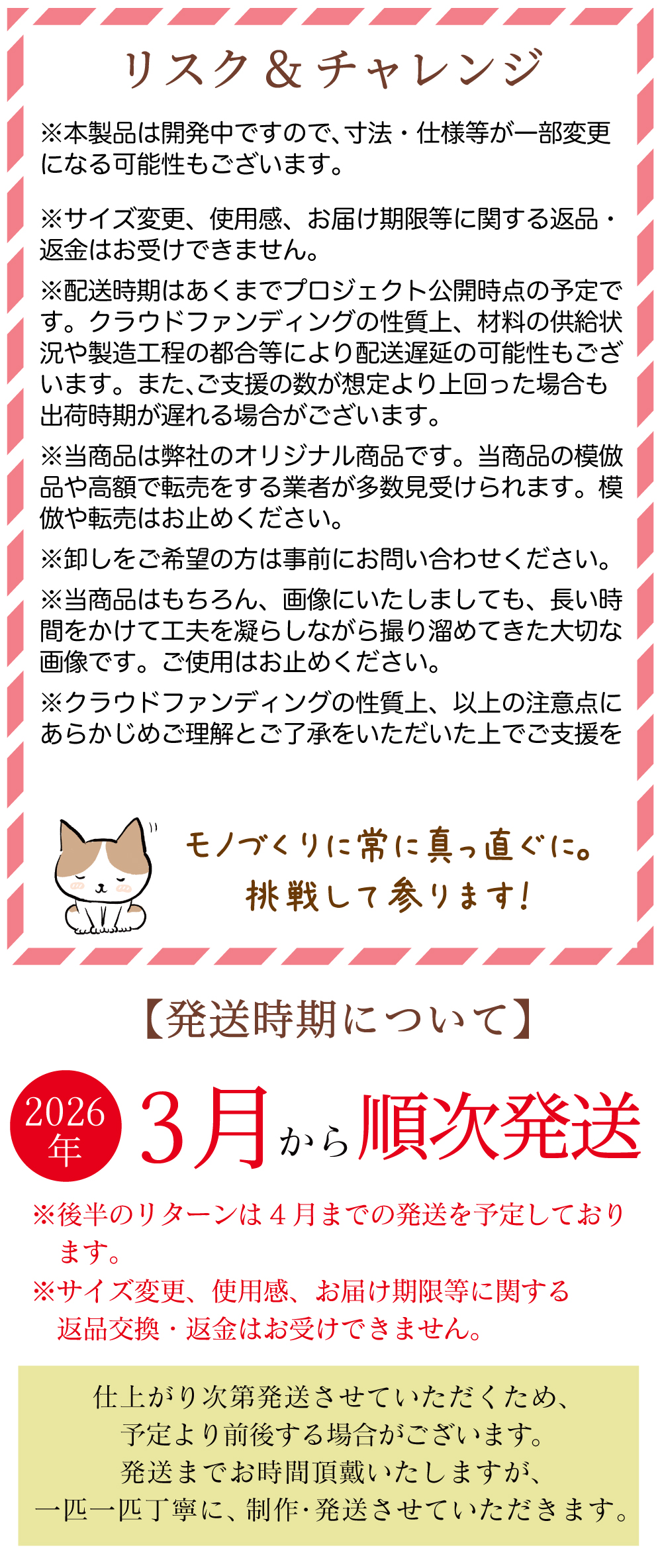 発送スケジュール:発送スケジュールは予定となっております。予想以上にご注文をいただいた場合や製造状況、運送会社の配送状況などにより変動する場合があります。予めご了承ください。
