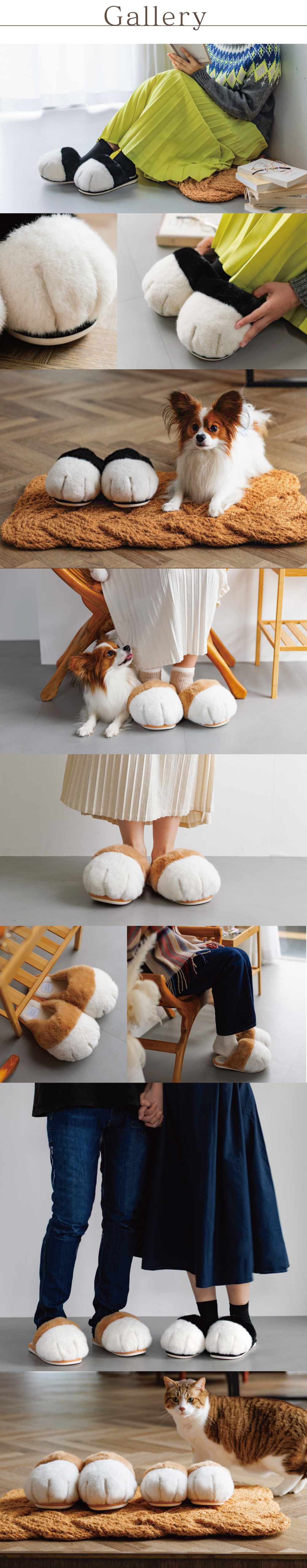 ねこの手をモチーフにしたフワフワ手触りのスリッパです。愛らしいフォルムと素朴な色合いを表現しました。