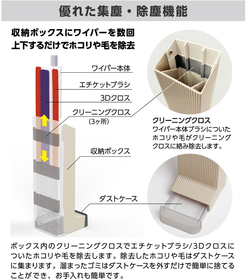 かきとる・拭き取る2種類のブラシがゴミをしっかりキャッチします。