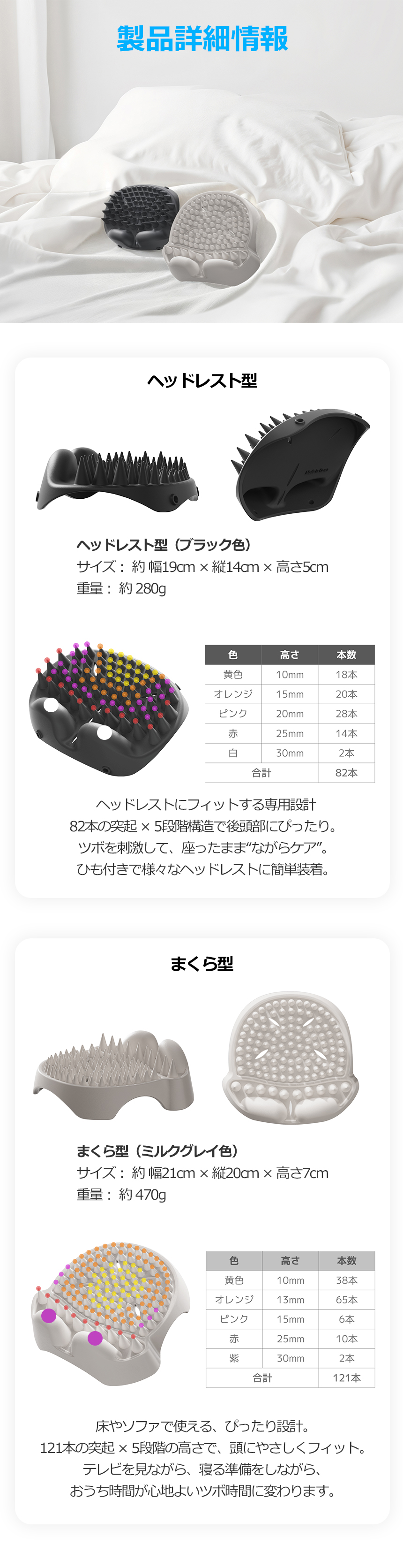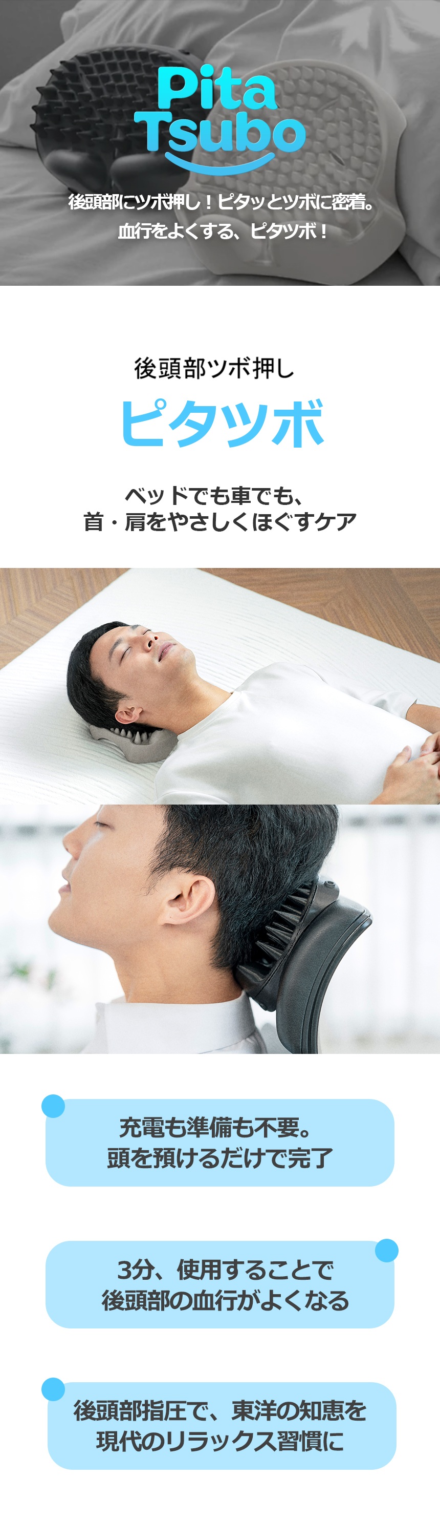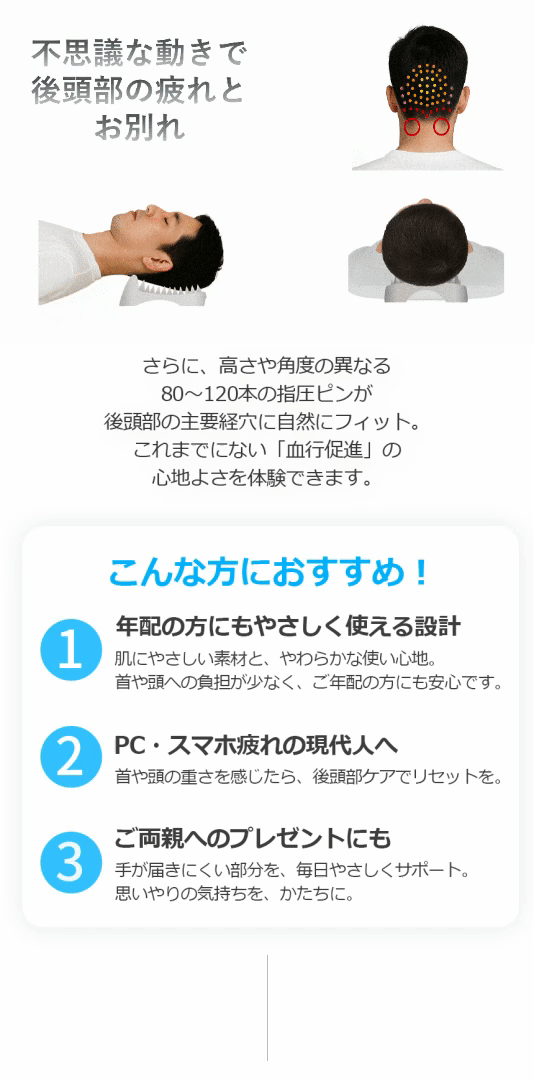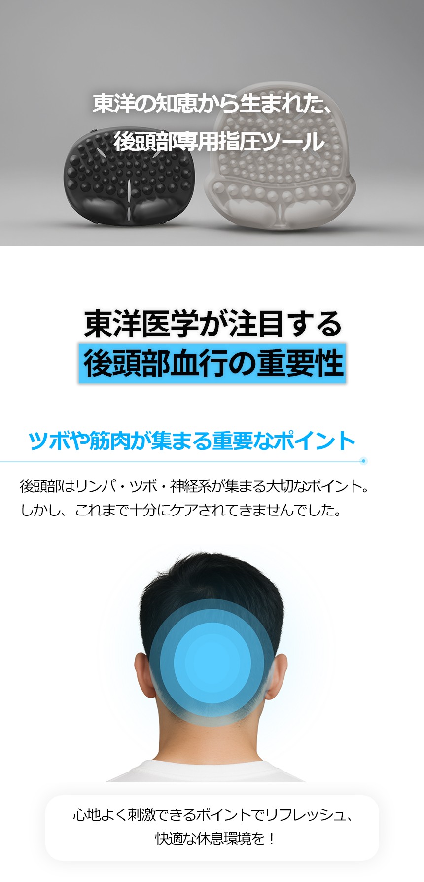 後頭部専用設計で首から後頭部のツボと筋肉を刺激。TPE素材でやわらかく弾力があり、無毒無臭で快適に使える。