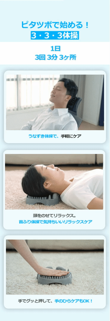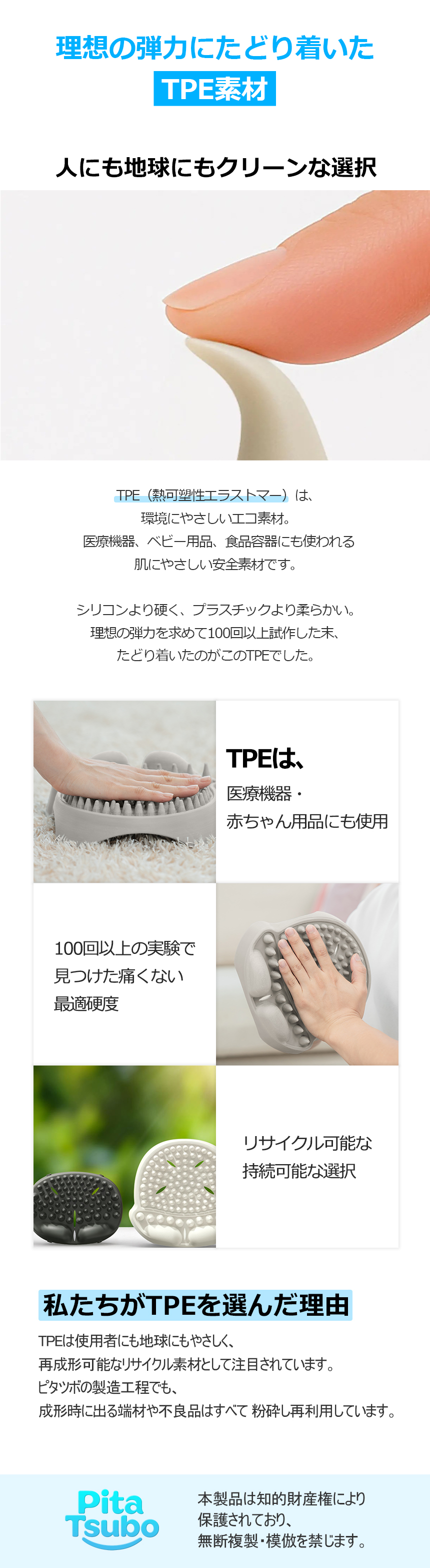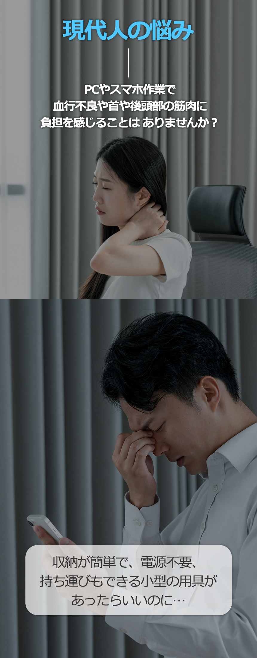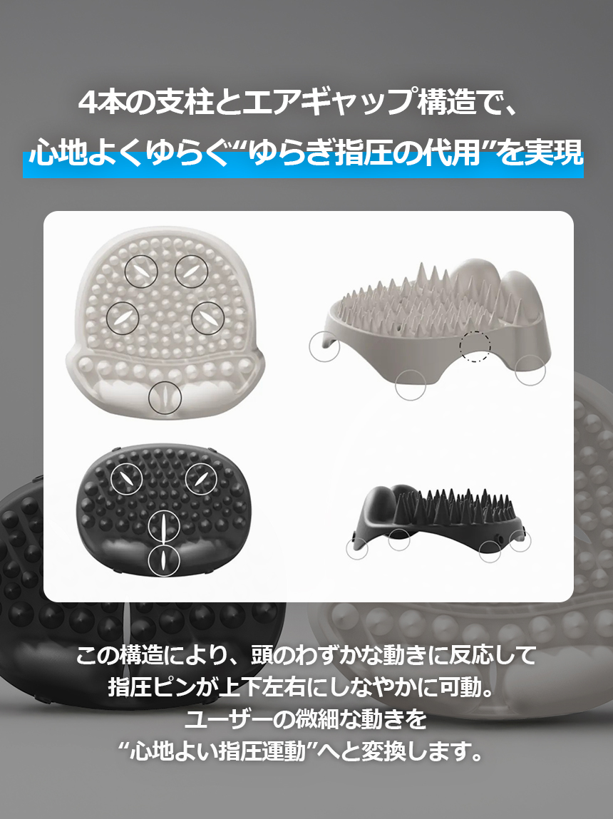 後頭部専用設計で首から後頭部のツボと筋肉を刺激。TPE素材でやわらかく弾力があり、無毒無臭で快適に使える。