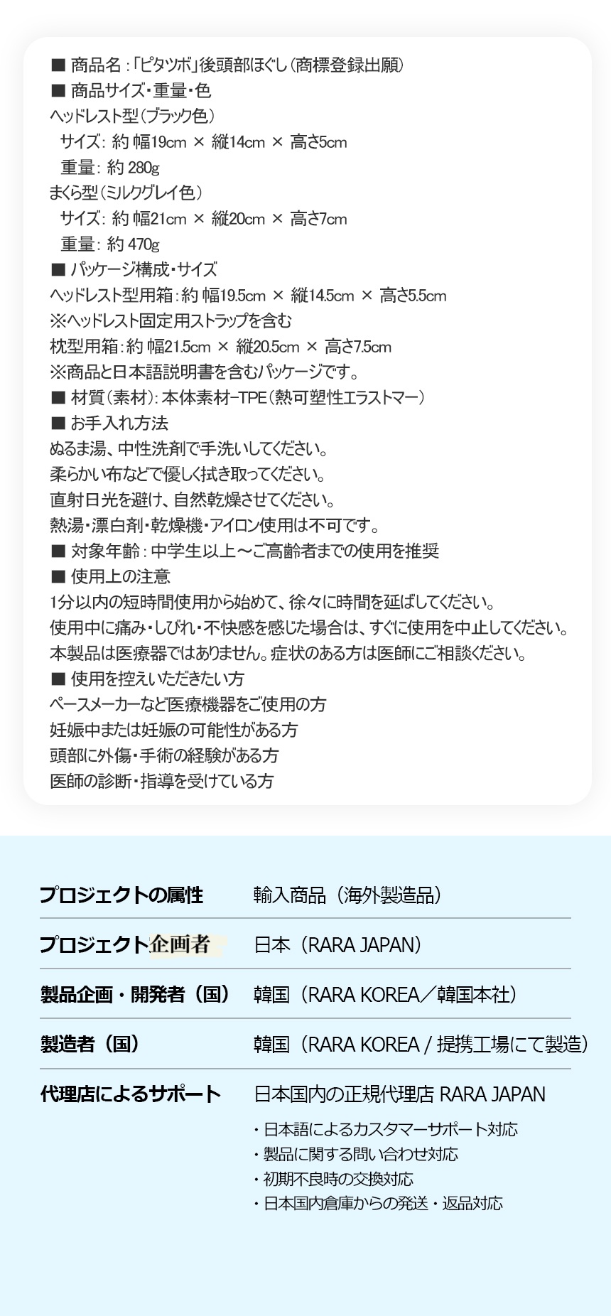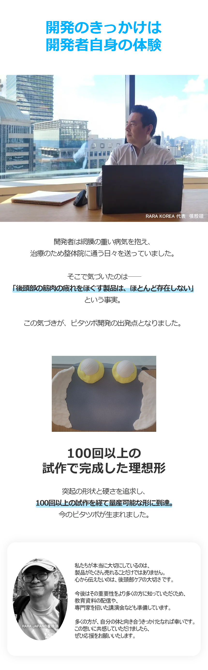 ・リターンの発送が完了するまで、RARA JAPANは ピタツボ後頭部ほぐしの日本における独占販売権を有する正規代理店です。