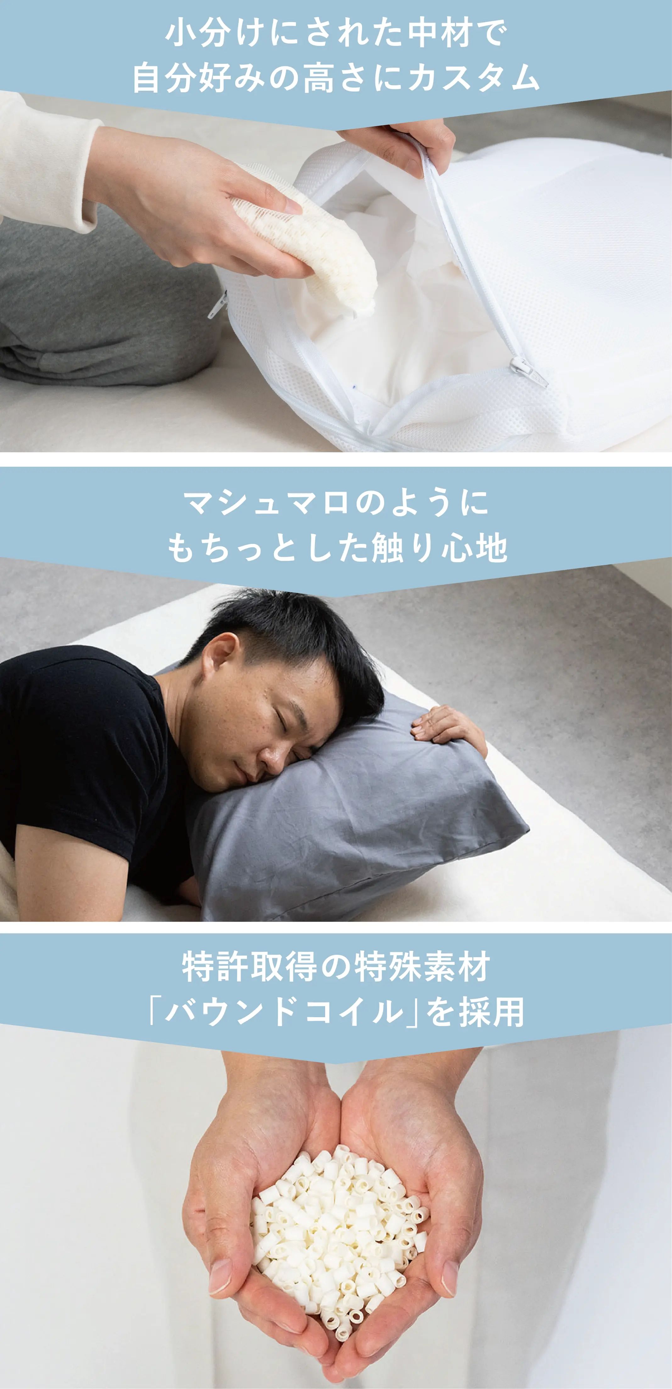 特許取得素材の「バウンドコイル」はマシュマロのようなモチッとしたクッション性とソフトな触り心地を実現。中材が小袋に小分けにされているので自分好みの高さにカスタムすることもできるので、睡眠環境への悩みを解消してくれる新感覚な枕です。そんな弾力性・触り心地の他にも通気性や好みの高さにカスタムできたり、洗濯も可能などの機能が詰め込まれています。
