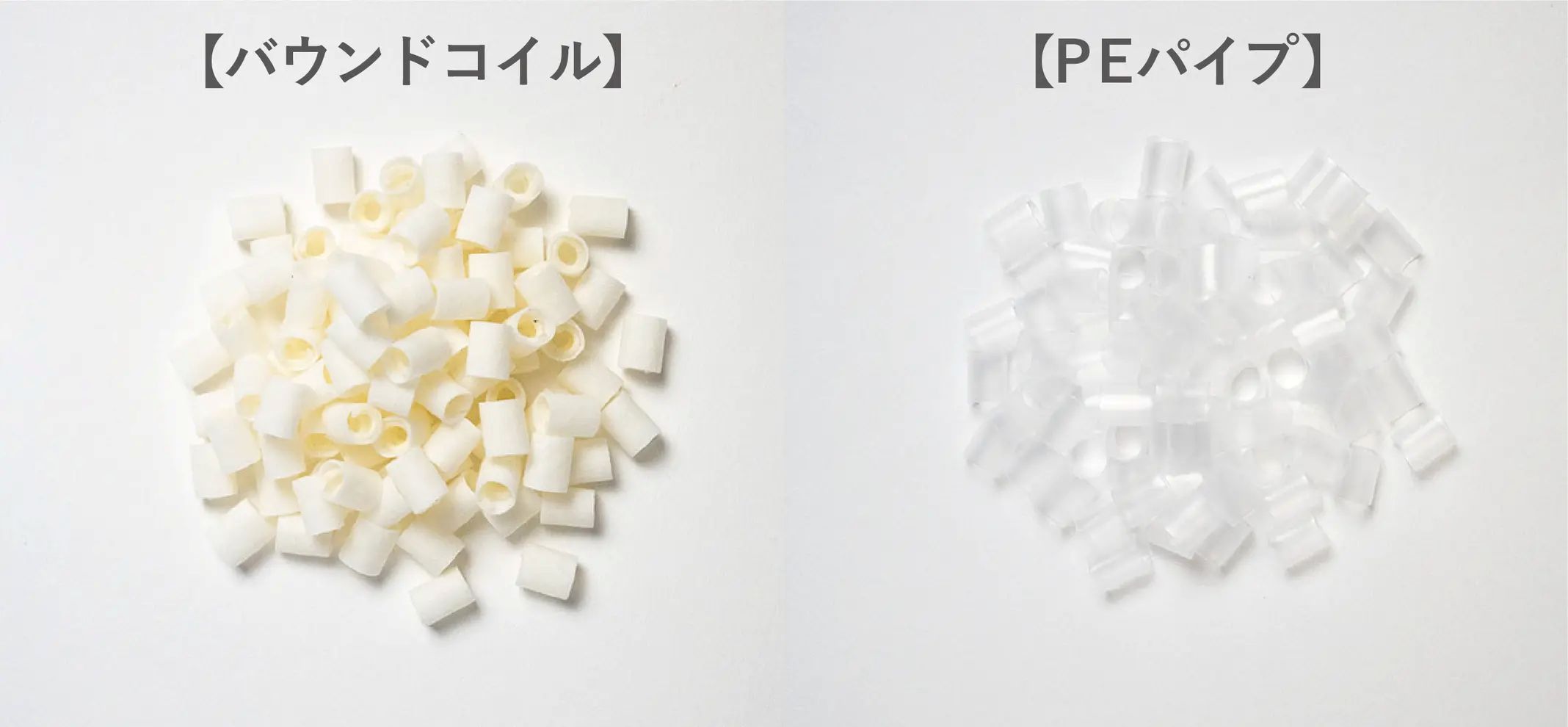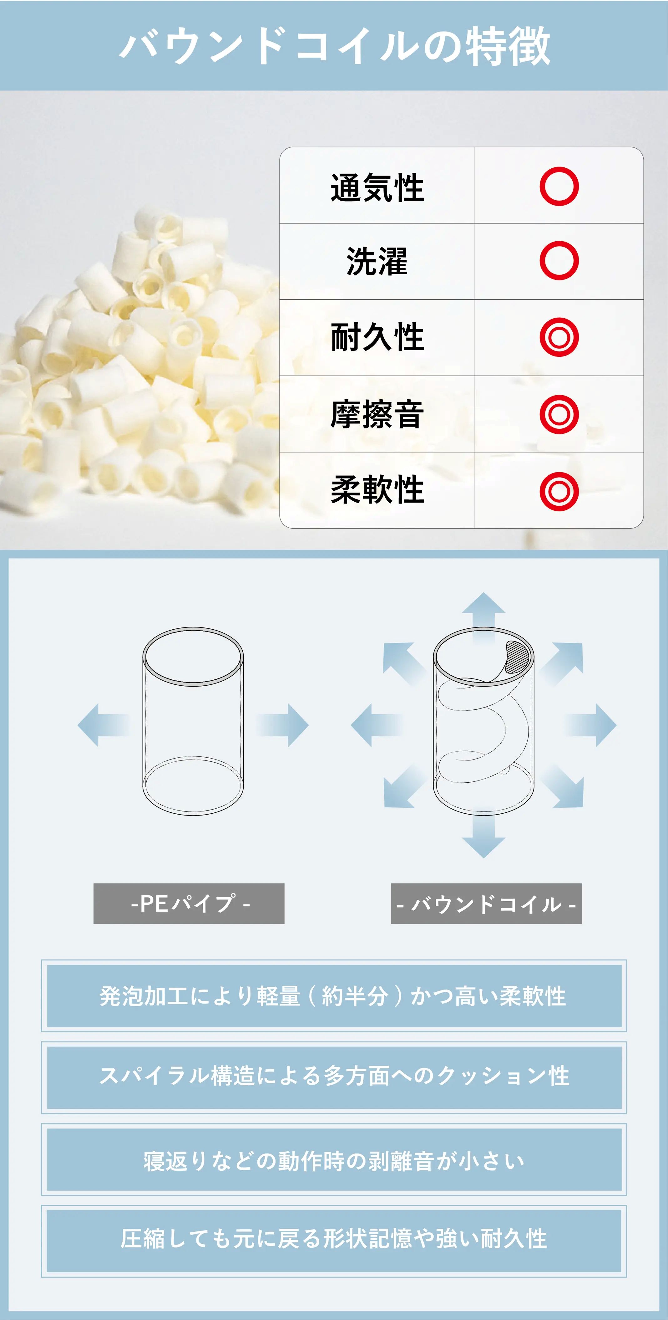 特許取得素材の「バウンドコイル」はPEパイプとはことなり、パイプ内部がスパイラル構造になっているため、あらゆる方向でクッション性が生まれる弾力性があります。そんな柔軟性と反発力をあわせ持つ特殊な構造で、PEパイプやウレタンとはまったく違う寝心地を実現しました。