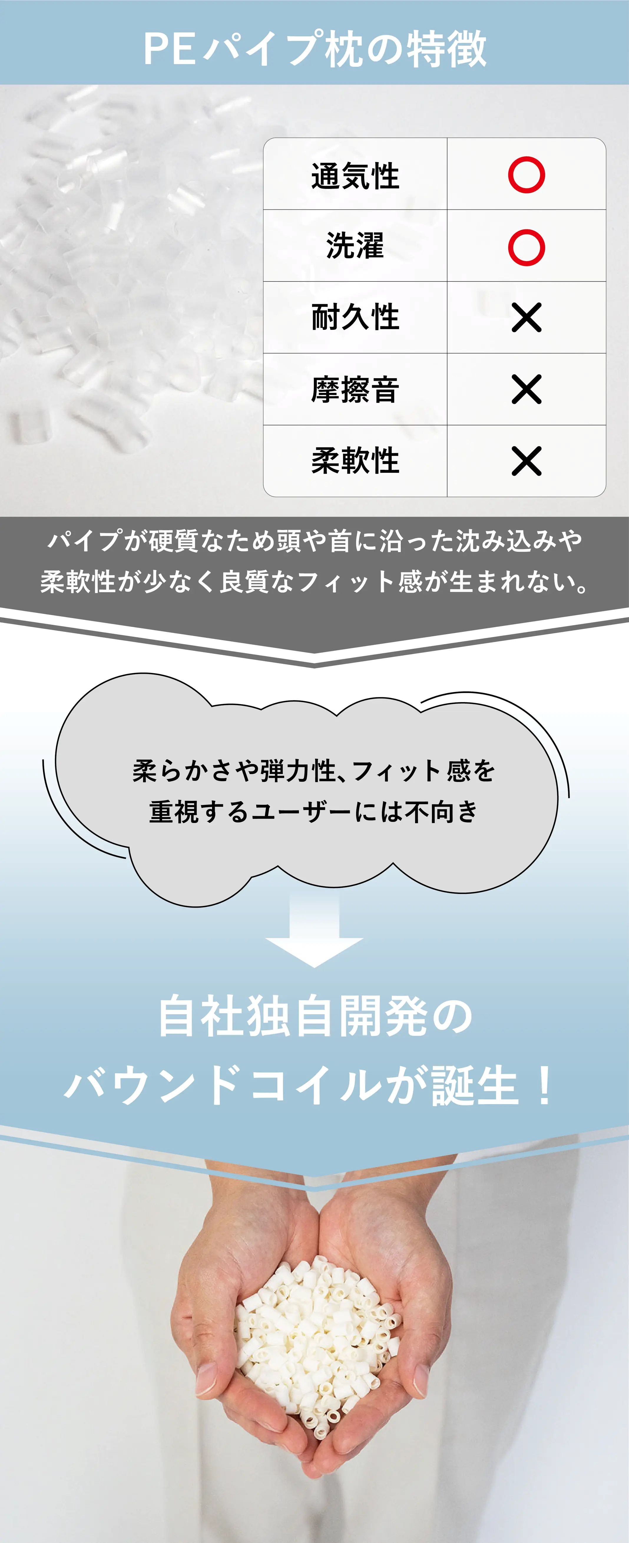 PEパイプに見られる「硬さ」や「ゴツゴツ感」とは異なり、スパイラル構造が衝撃を分散し、やわらかく、しなやかな使用感になります。頭の動きに合わせて優しく受け止めるように反応し、寝返りや姿勢の変化にもスムーズに対応し、これまでにない心地よさを生み出しています。