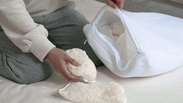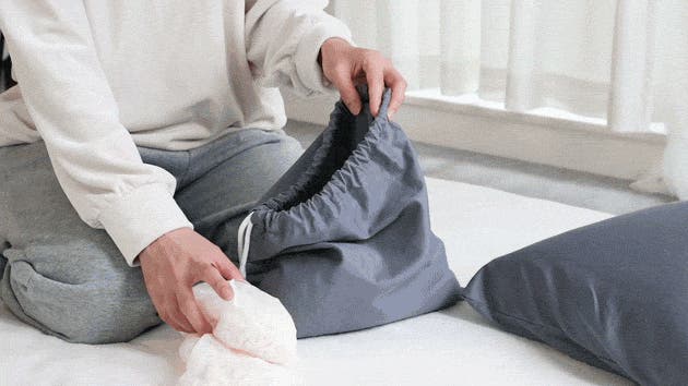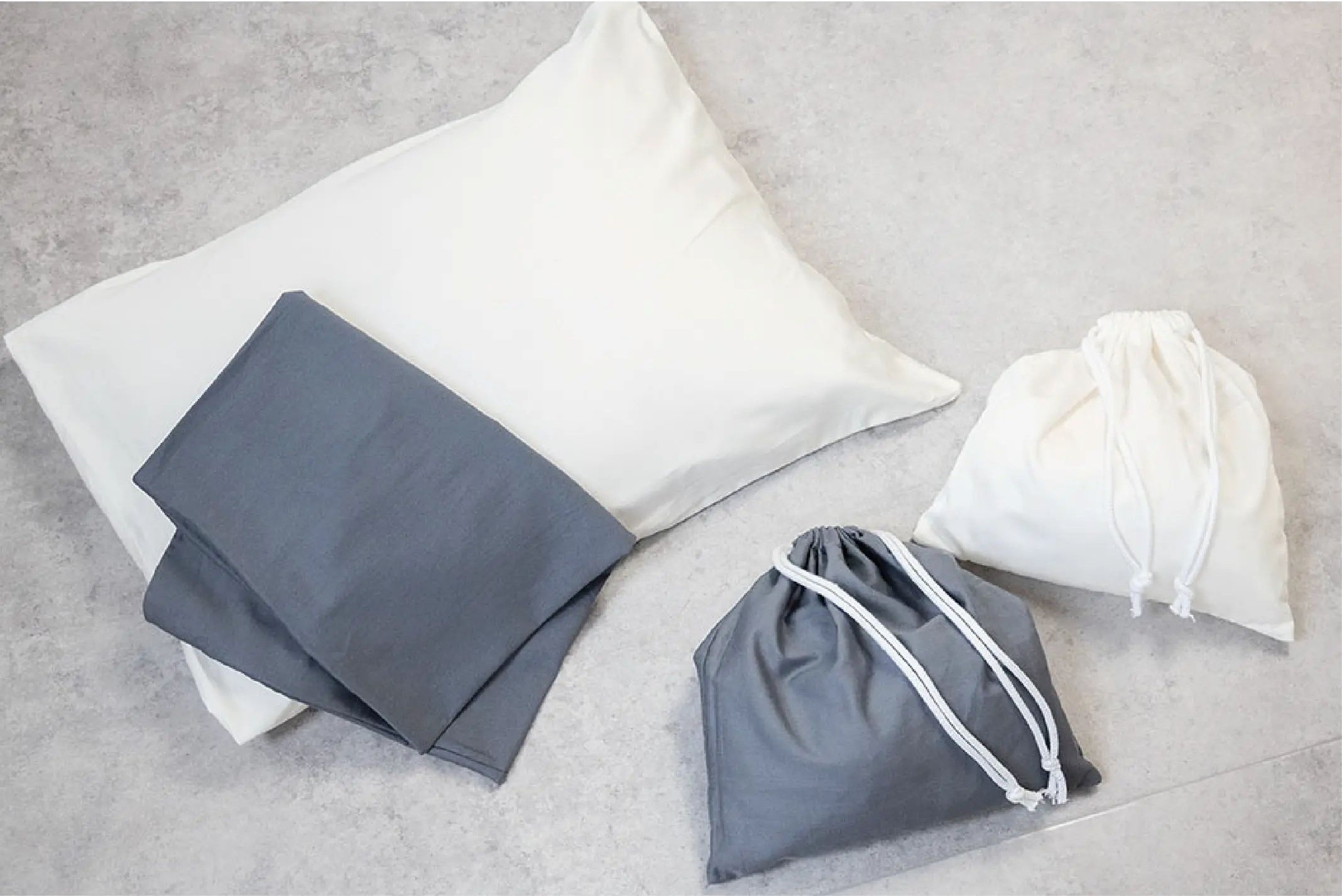 自分好みに高さをカスタムすると、どうしても余ってしまう中材...。そんな中材も枕の付属で巾着袋がついてくるので、その中に入れて保管いただけます。