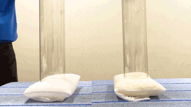 従来のPEパイプでは課題とされていた「圧縮による変形の残りやすさ」や「弾力があまりない」などの問題点を「バウンドコイル」は大きく改善しました。圧縮保温開放試験でもその性能が確認されており、長期間の使用や圧縮収納をしてもヘタリにくいのが特長です。