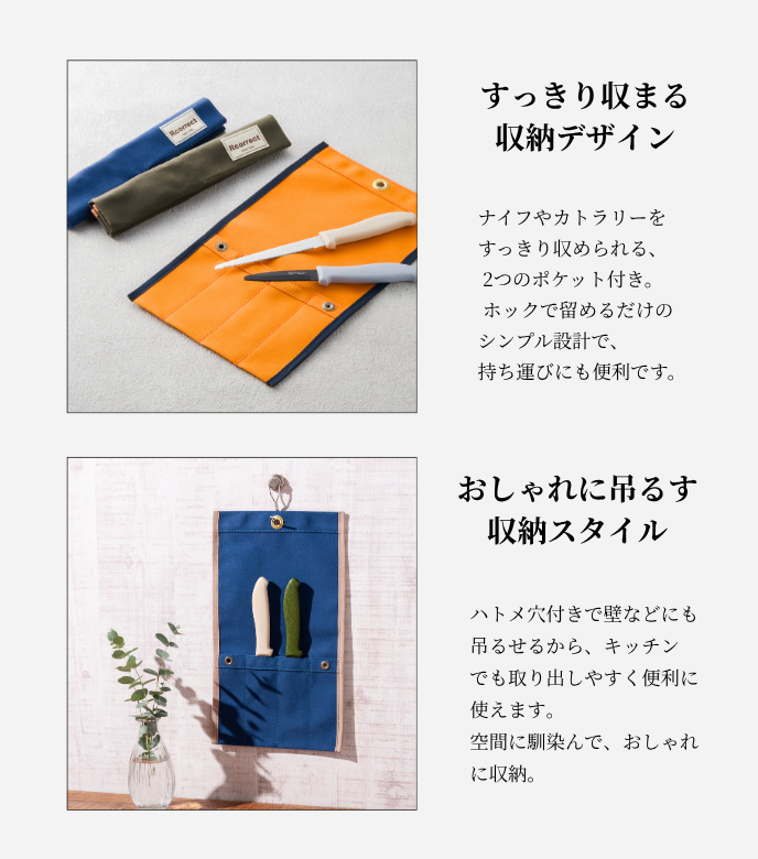 キッチンでもアウトドアでも使いやすい、吊るしても、持ち運んでもOKなナイフケースです。