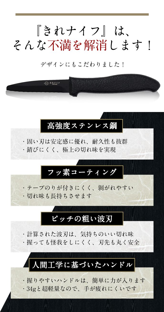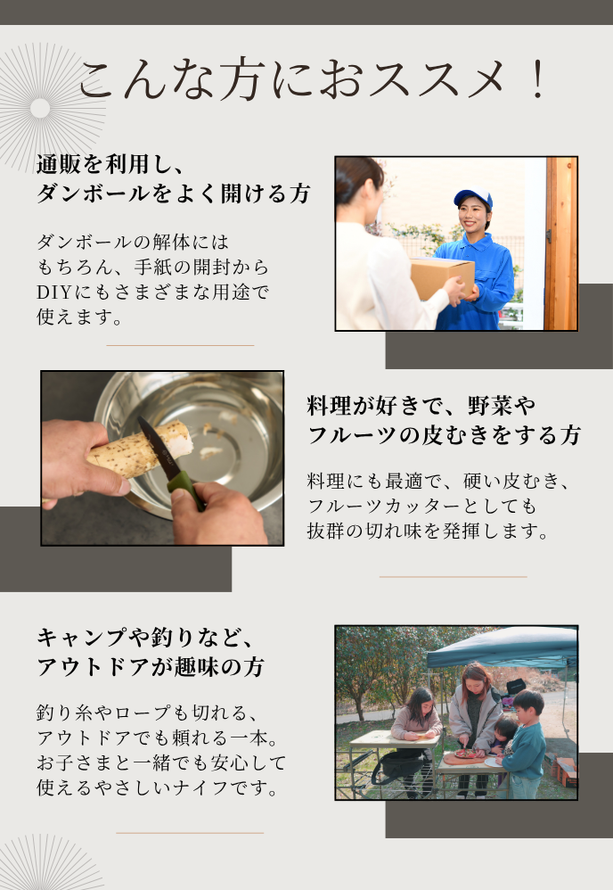 安全性と切れ味を極めた唯一無二の一本。梱包作業・料理・アウトドアまで幅広く使える万能ナイフ。防災用にも。