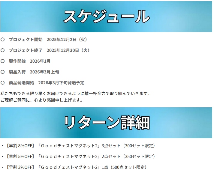 ・使用部材の供給状況、製造工程上の都合等によりリターンの発送時期が遅れる場合がございます。