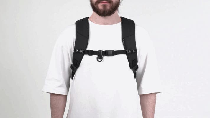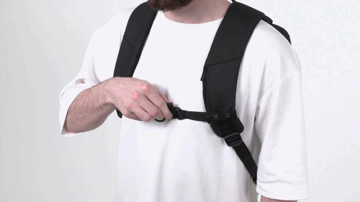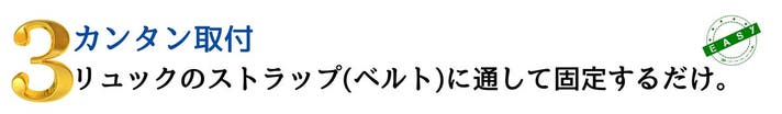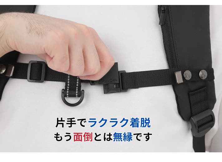 リュックの両肩ベルトに本体を通し、バックルを“カチッと”留めるだけ。