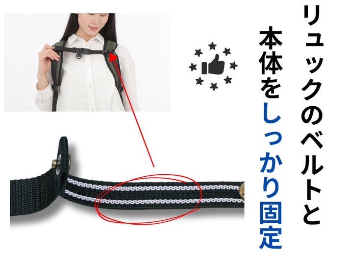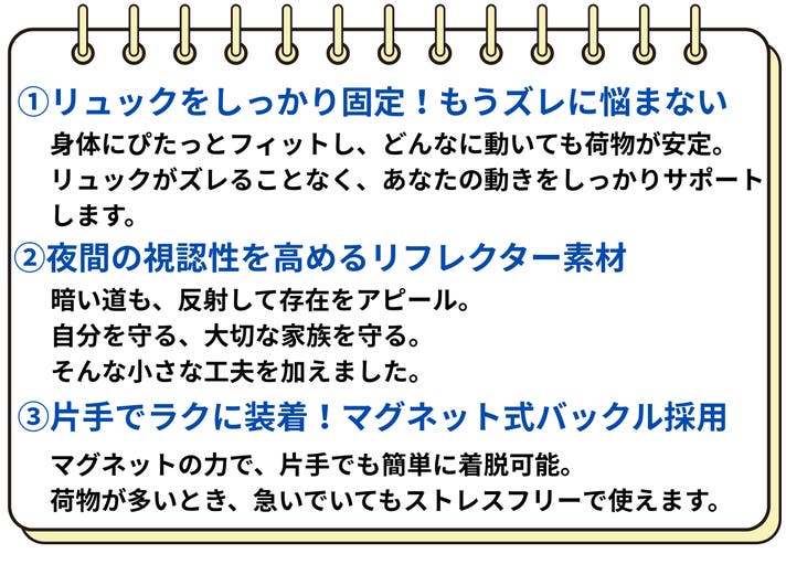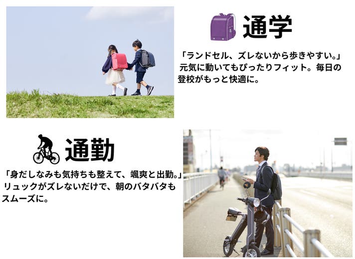 リュックのズレを防ぎ、通勤・通学・旅行など幅広く活躍。