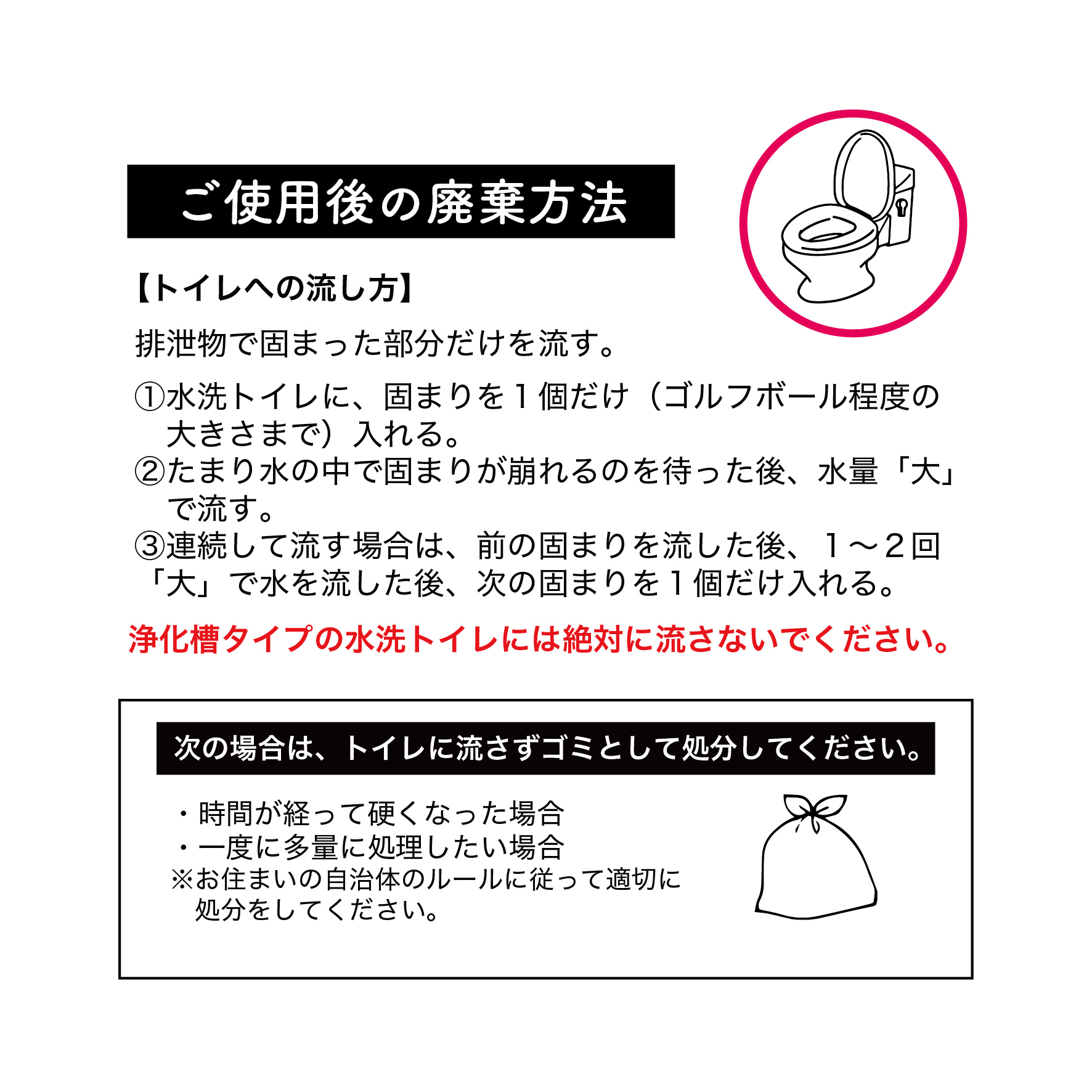 A.水溶性なのでトイレに流すことができます。一度にたくさん流すと詰まる危険があるので、取扱注意を確認の上、少量ずつ流すようにしてください。
