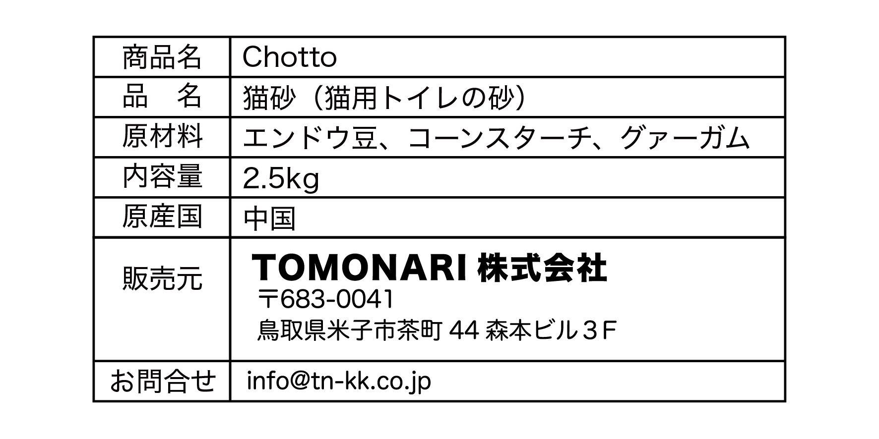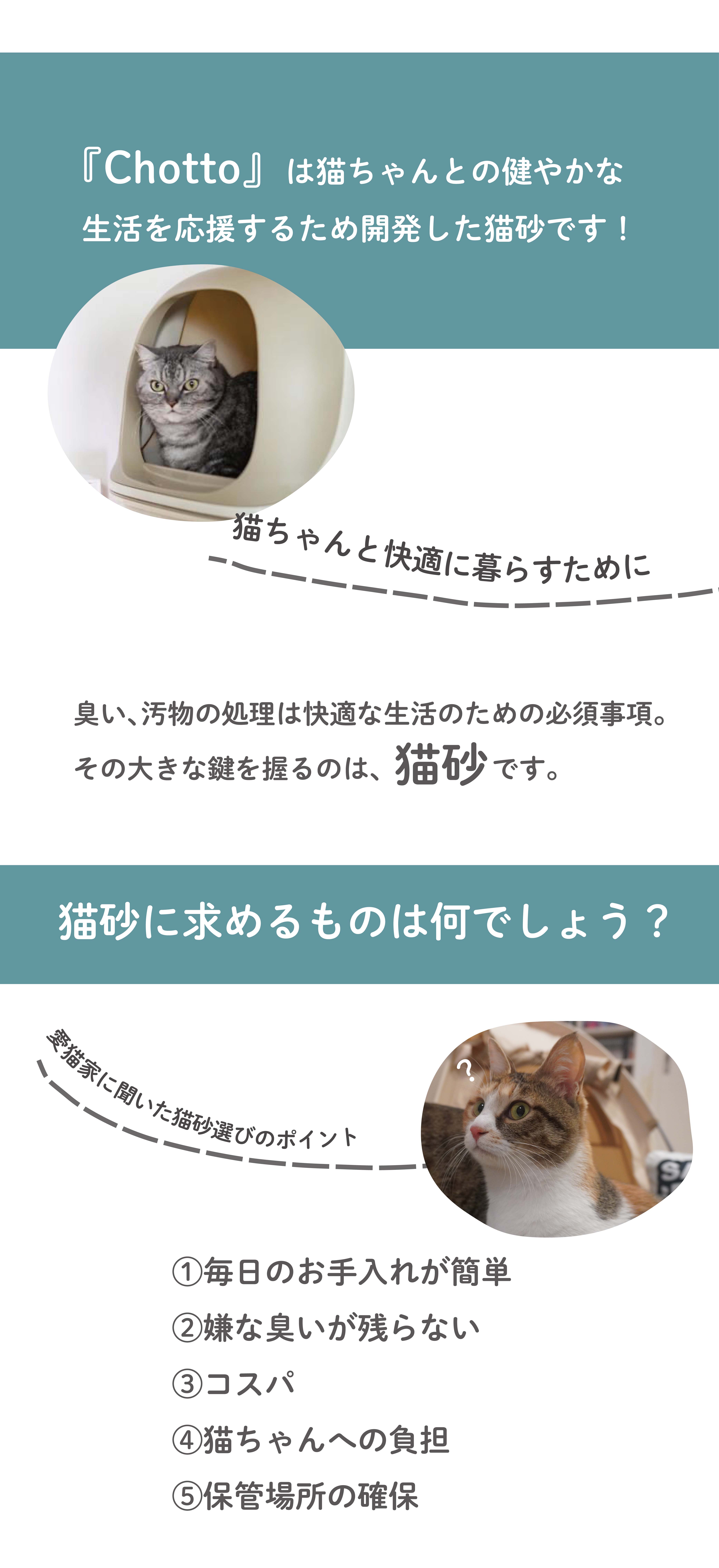 新たに立ち上げた猫用品ブランド『Tomonyan』の第一弾製品『Chotto(ちょっと)』は、植物由来の原材料を使用し、自然の力を活かして少ない量でも高い吸水性と凝固性を実現しました。「ちょっと」の量で、猫にも飼い主にも、そして地球にも「ちょっと嬉しい」を届けたいという思いを込めています。