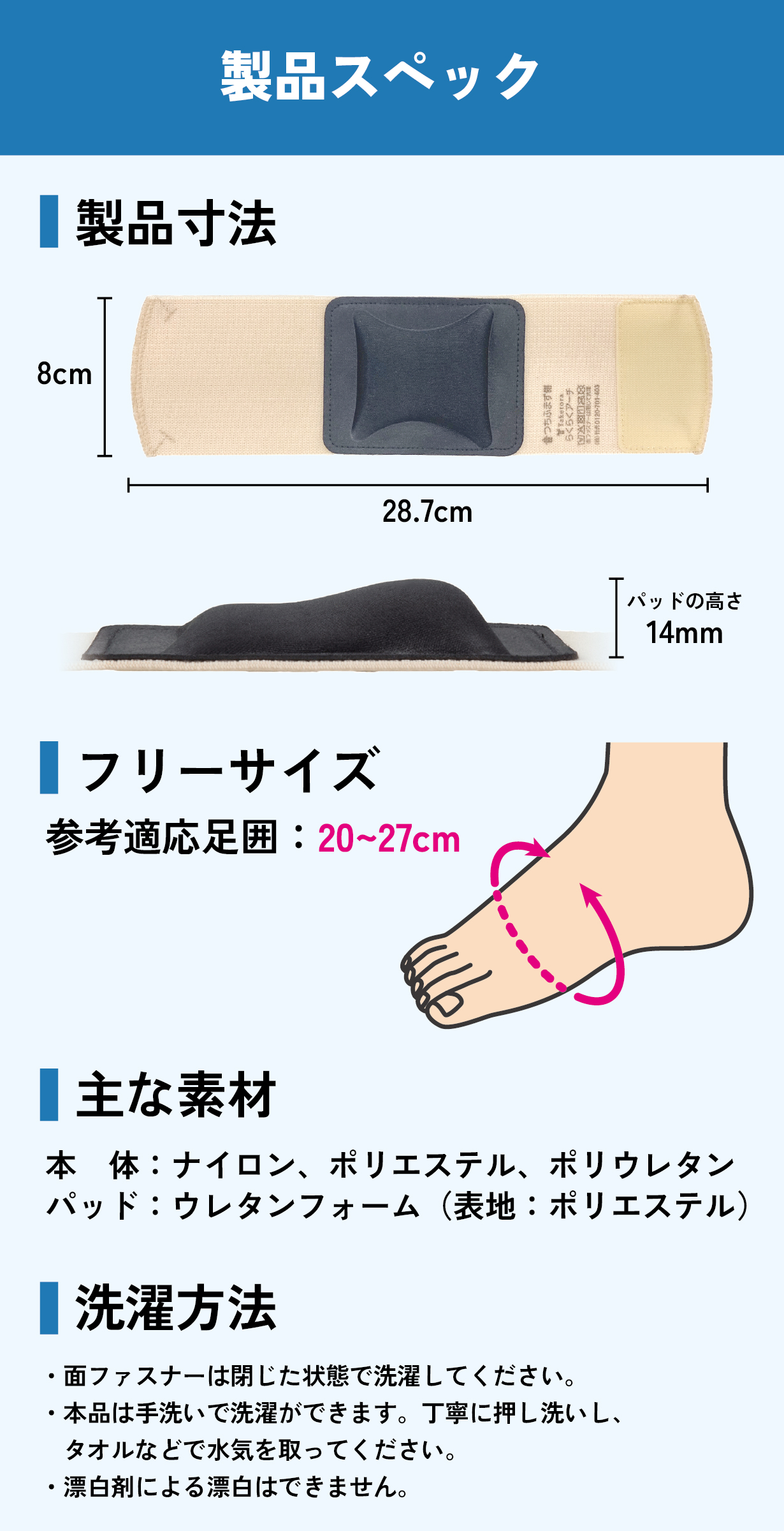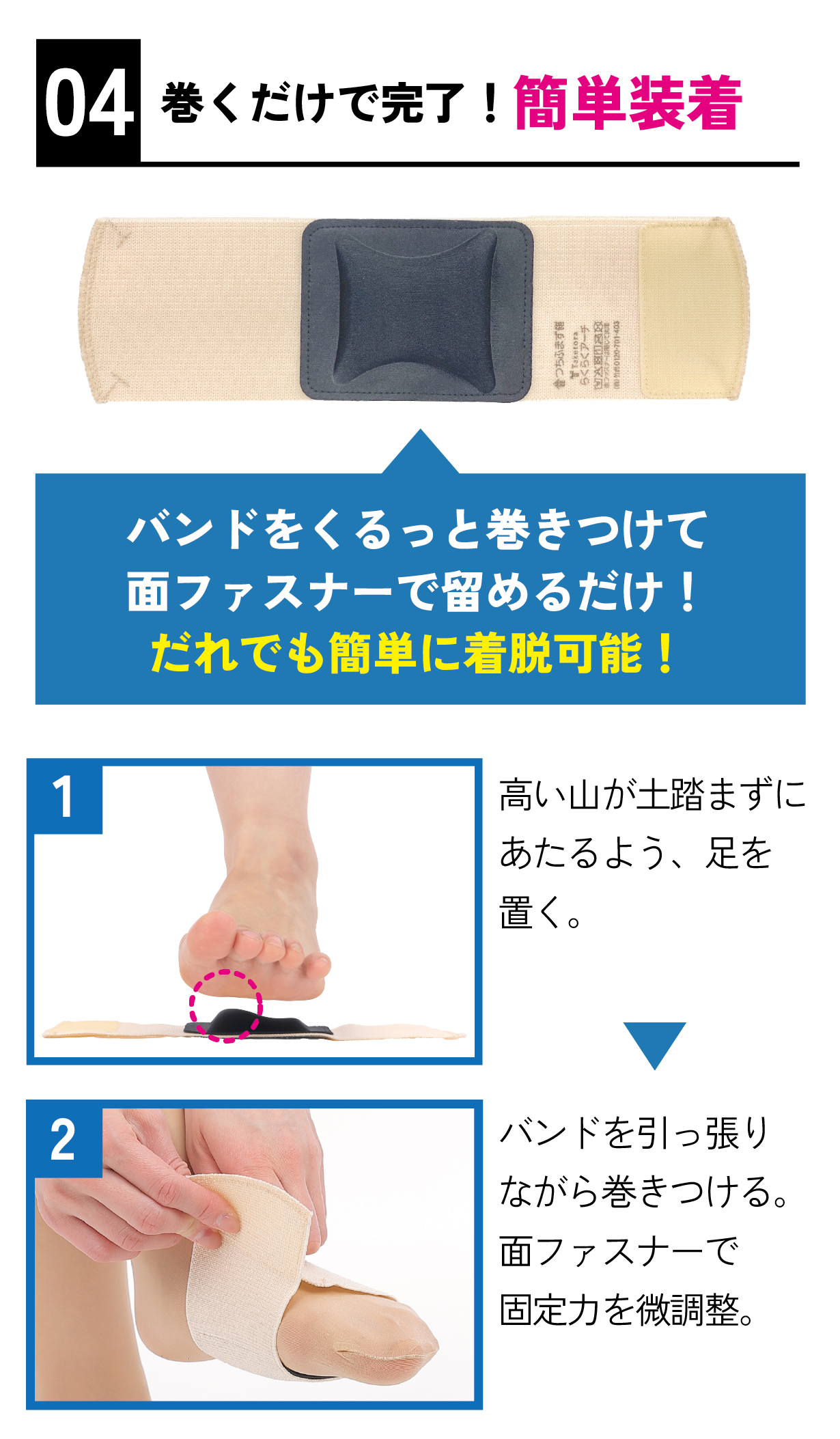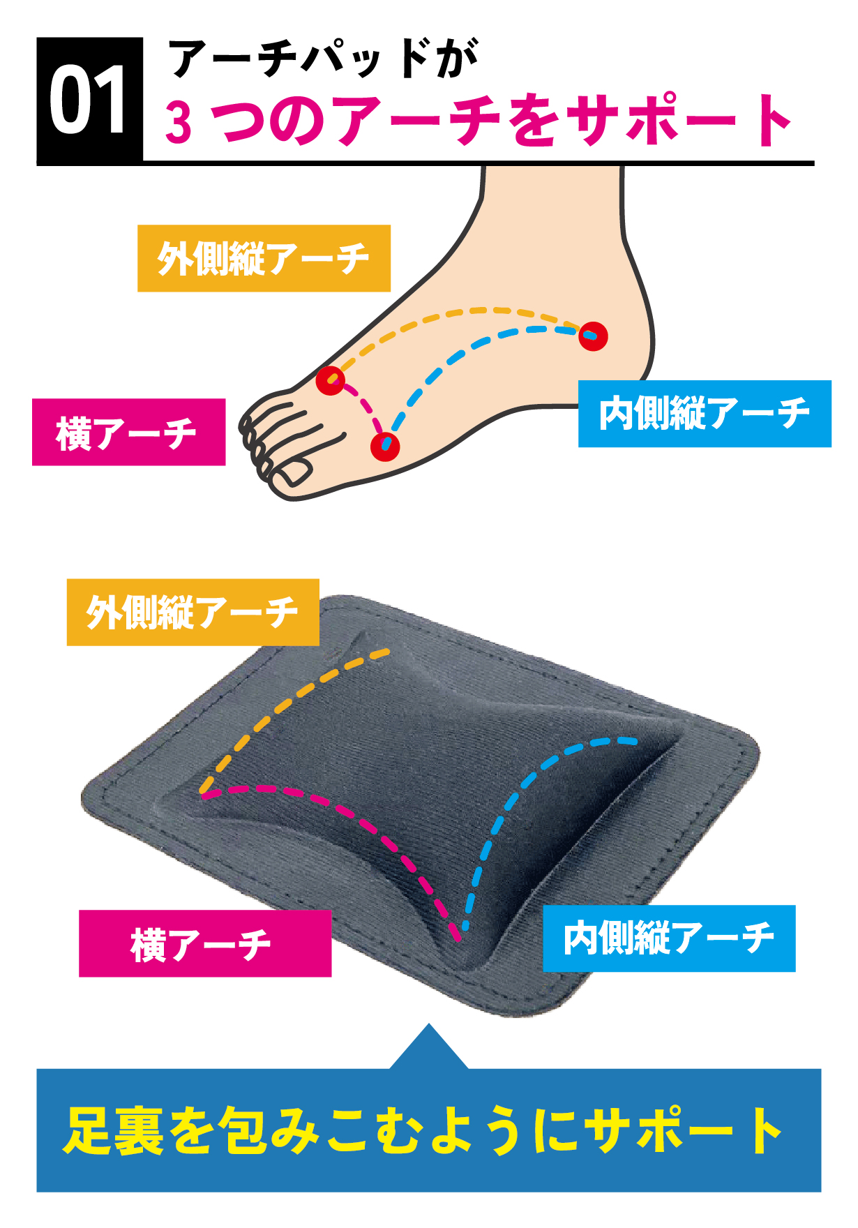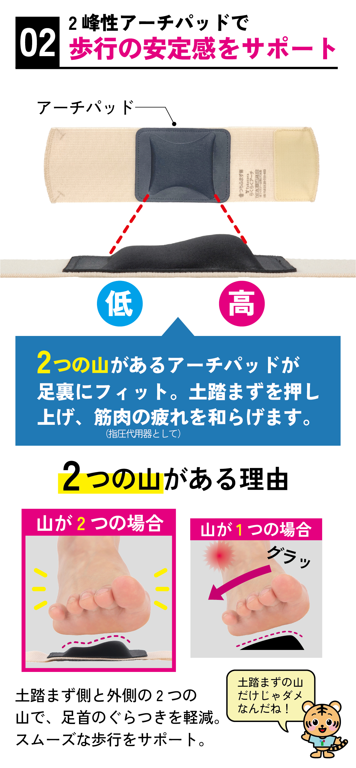 ・パッドの高い方で内側縦アーチをサポートします。