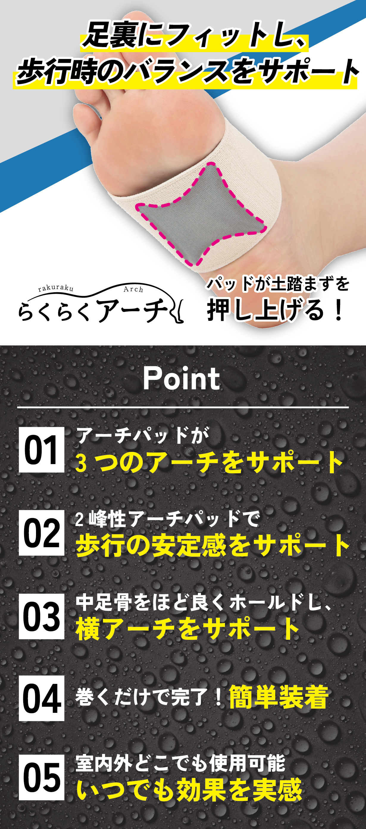 装着するだけで足裏アーチをサポート!立ちながら・歩きながら足裏のコリをほぐす!