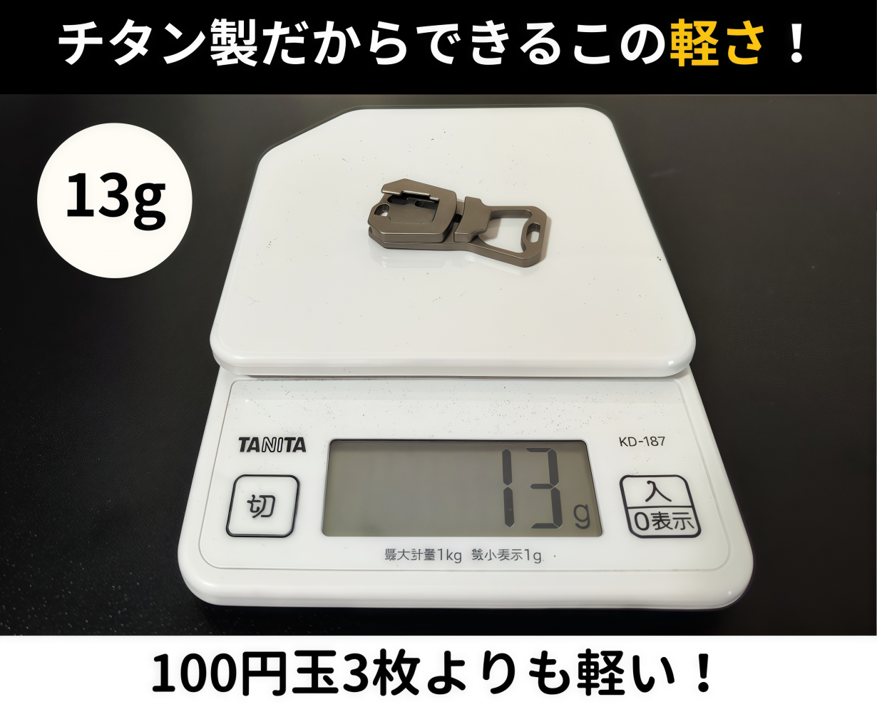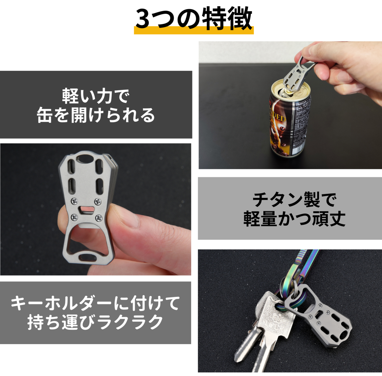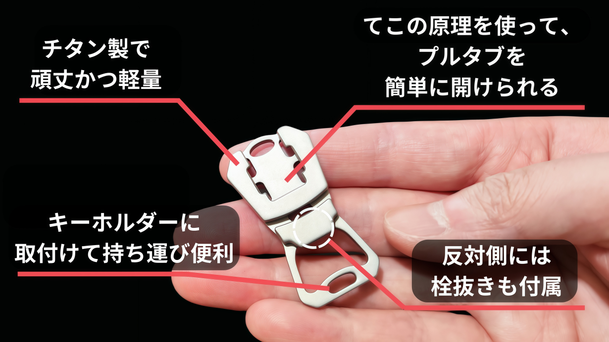 指先や爪に負担をかけず、軽い力で缶のプルタブを簡単に開けられる。超軽量でありながら高強度のチタンを採用。