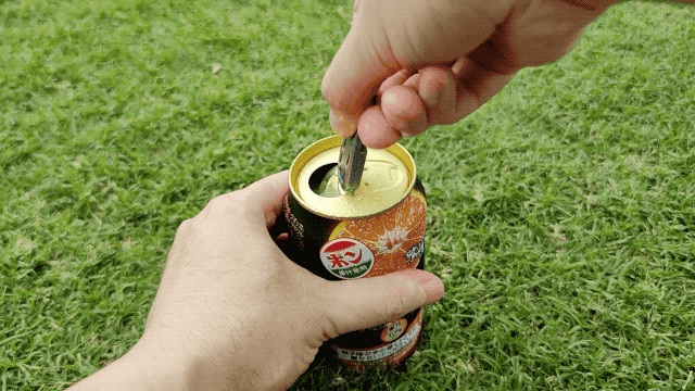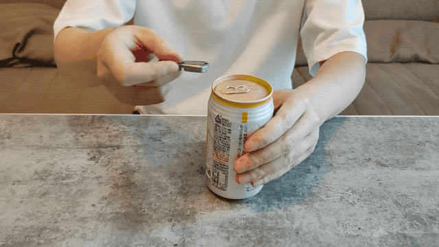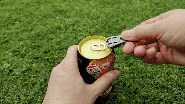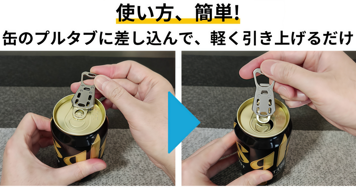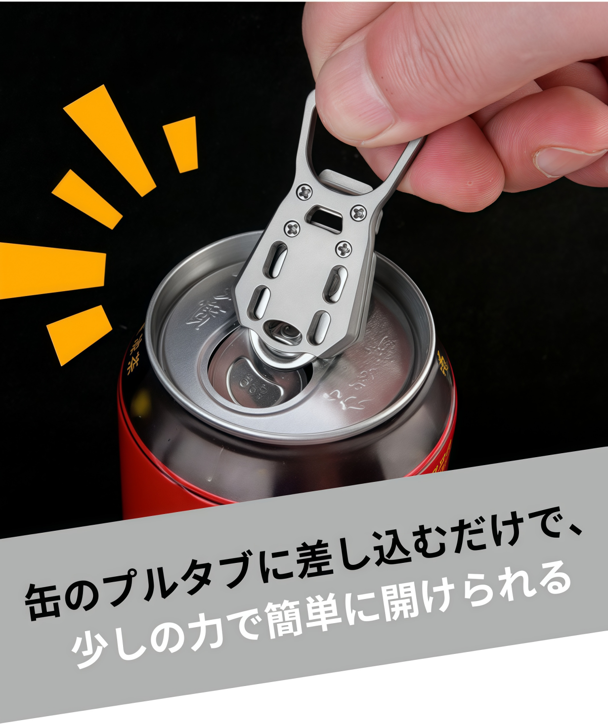チタン製プルタブオープナーを使えば、誰でも軽い力でほんの一瞬で缶のプルタブを開けられます。