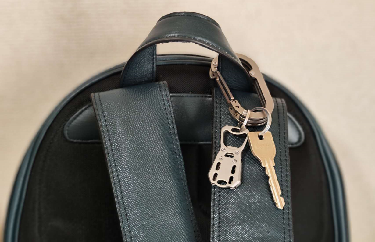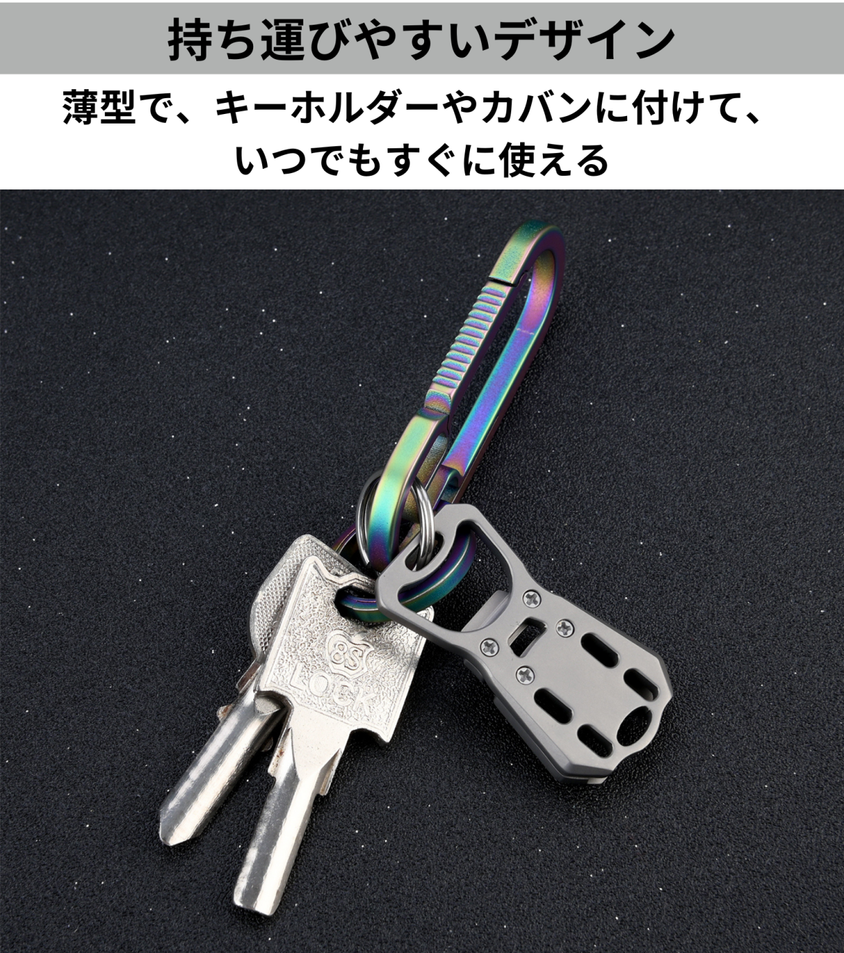 A:オープナーにはキーリング穴があるため、キーホルダーやカラビナに付けて携帯できます。また、薄型設計バッグやポケットに入れても邪魔になりません。