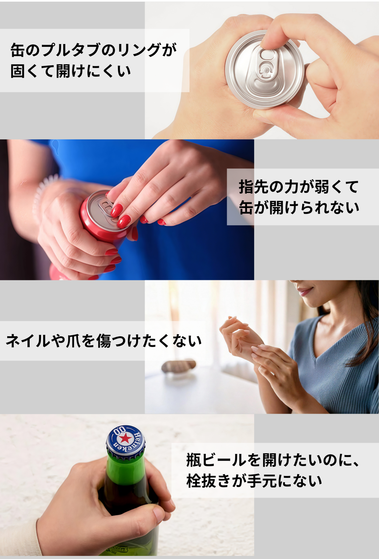 ネイルをしている女性が缶を開けられず困っている姿や、指先の力が弱い方が何度も挑戦して諦めてしまう場面を、私たちは何度も目にしてきました。