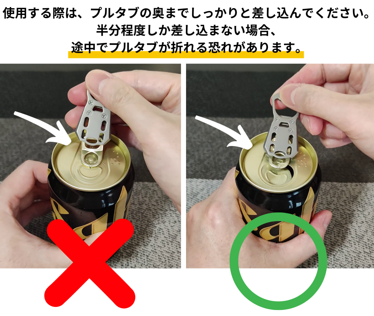 缶のプルタブを開ける際は、オープナーの先端をプルタブの隙間にまっすぐ差し込み、奥までしっかりと押してください。