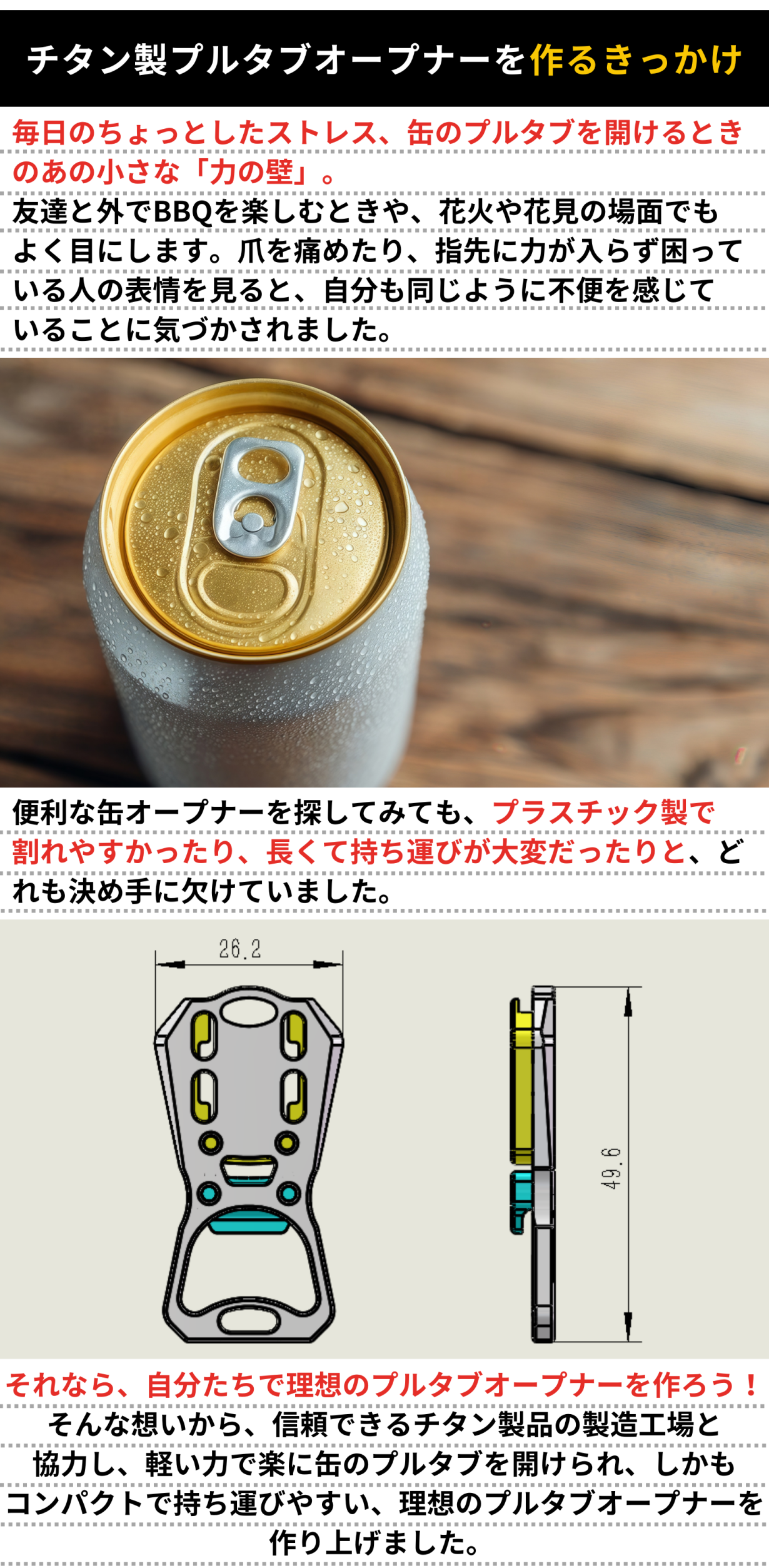 その瞬間の笑顔のために——私たちは、チタン製プルタブオープナー「TiPry」を完成させました。