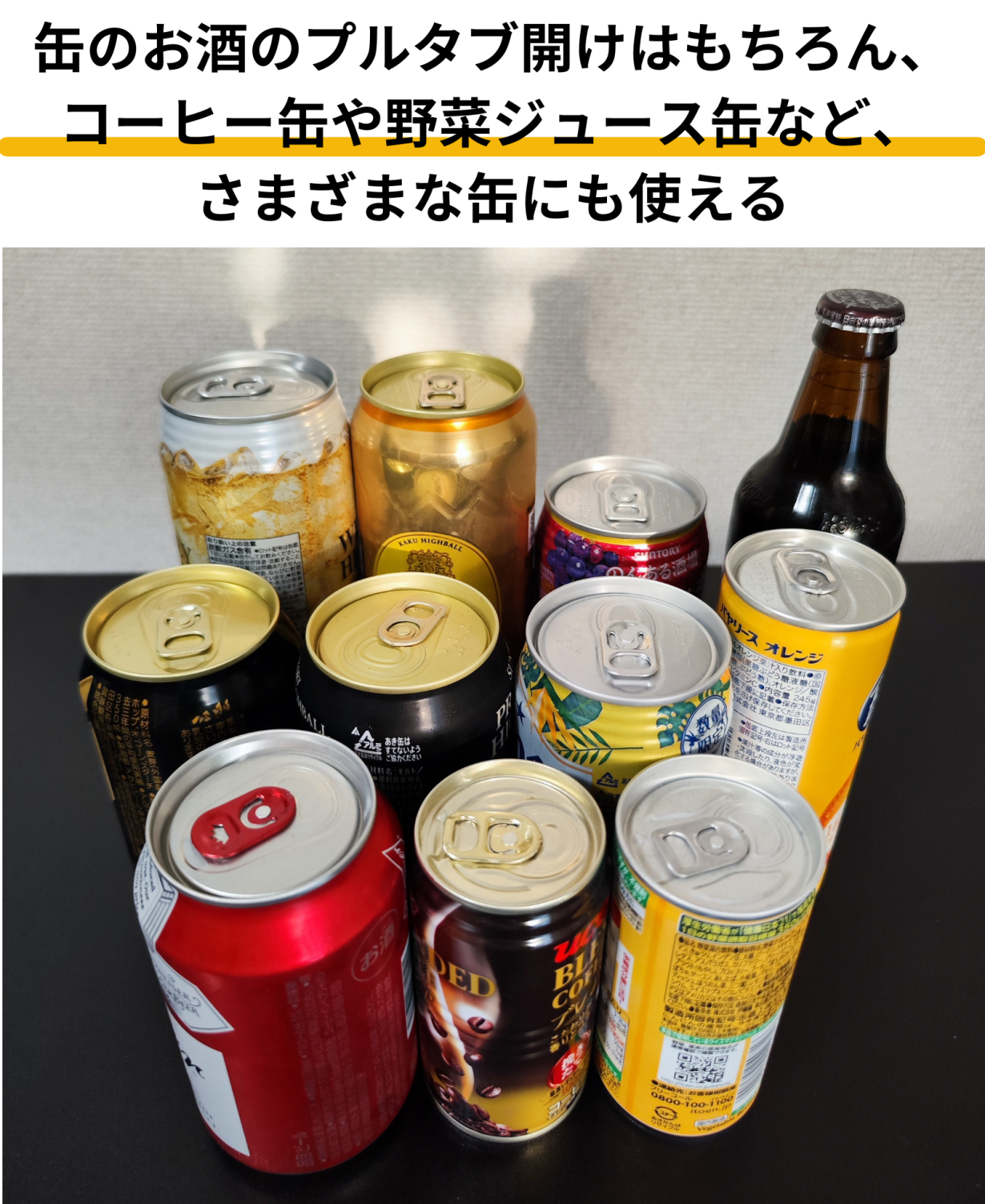 ※幅2cm以下のプルタブに対応しています。一般的な飲料缶(350ml・500ml)や食品缶など、多くの缶にご使用いただけます。